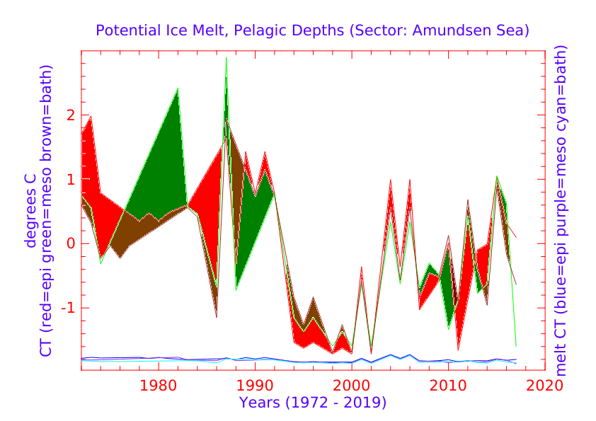 NOTE: The "CT melt" lines (bottom area of graphs) are not filled-in with colors. The "CT" colors (upper area of graphs) are selected by the line locations, in that, when a line representing a particular depth is either on top or on the bottom, that area is filled with that line color. The purpose for this technique is to show that the heat content at each depth level increases and decreases over time as "hot flows to cold, warm flows to cool" according to the laws of thermodynamics (see e.g Quantum Oceanography, 2, 3, 4).