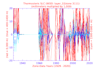 Lines above the zero point ('0'), no matter what color, show thermosteric sea level rise for the depth levels represented by that color, while lines below the zero point, no matter what color, show thermosteric sea level fall for the depth levels represented by that color.