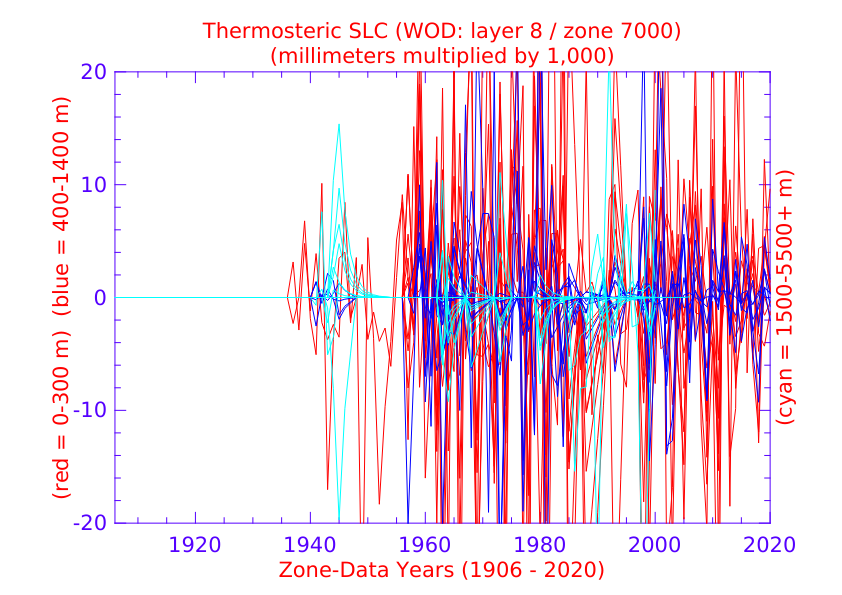 Lines above the zero point ('0'), no matter what color, show thermosteric sea level rise for the depth levels represented by that color, while lines below the zero point, no matter what color, show thermosteric sea level fall for the depth levels represented by that color.